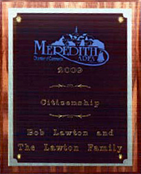“For your many years in business and for your contributions to your state and community, the Meredith Area chamber of Commerce is pleased to present the Citizenship Award to Bob Lawton and the Lawton Family.” |