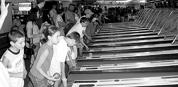 Skee-Ball continues today to be the most popular game at Funspot. On a busy day all seventeen machines will be in use with lines waiting.